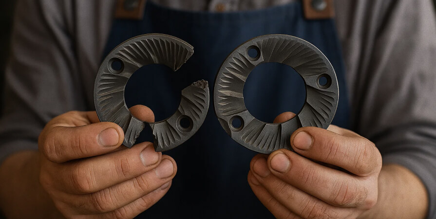 - Керамические — тихие, не греются, но хрупкие. Попадется камешек в зернах — привет, трещина или скол. Ремонт обойдется в 5-8 тысяч.